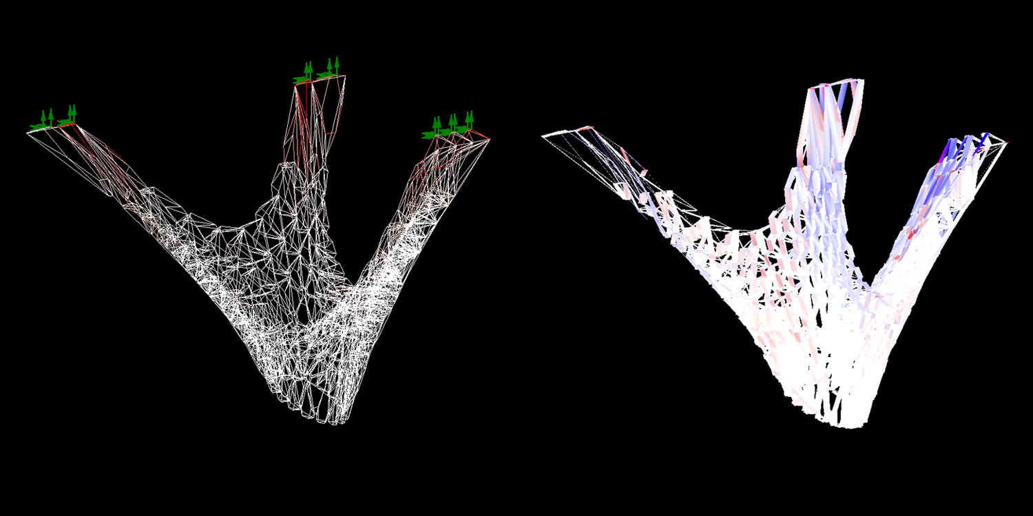 In order to be able to actively compensate loads and vibrations, these influencing factors initially have to be precisely recorded resp. predicted; a second step would be to calculate the necessary counter-movements in real time (and likewise promptly to implement them). Researchers from the University of Stuttgart developed simulation models for this purpose, enabling an exact prediction of the behaviour of the structure. The material stress as well as the vibration behaviour under static and dynamic exposure is thereby taken into account. These simulation models serve as a basis for the development of control concepts which calculate the necessary counter movements on load and vibration compensation depending on the recorded measured values. These movements are then precisely implemented through the hydraulics.