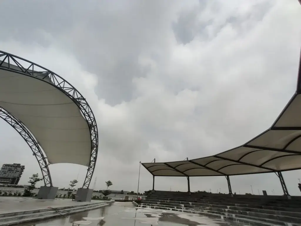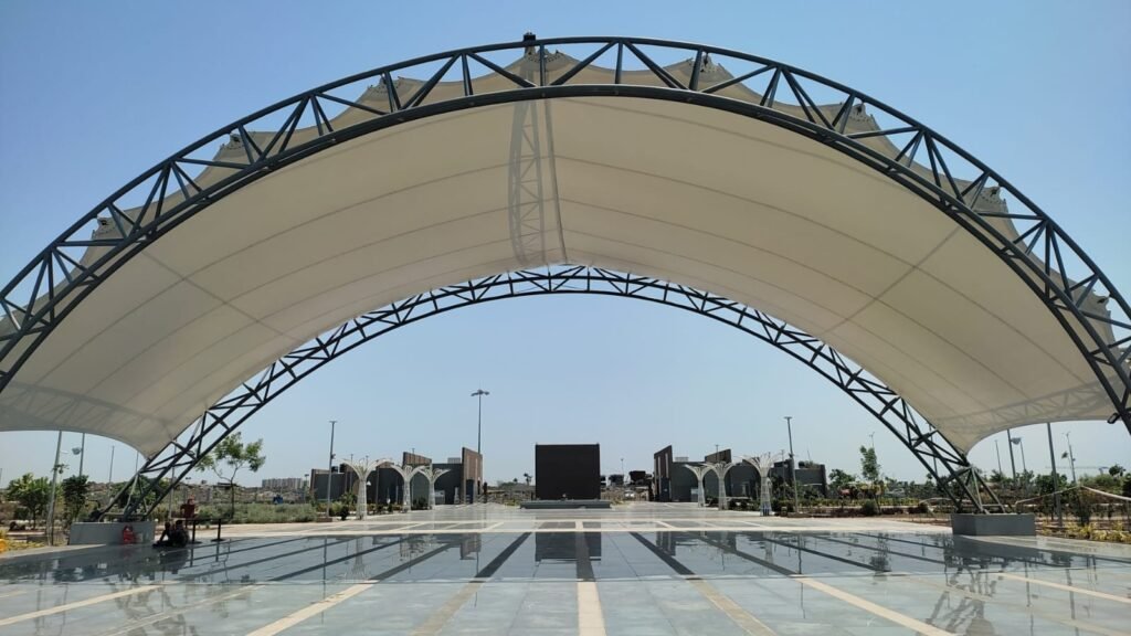 The structure features an inclined double-arch form, symbolizing progress and openness. Engineered with high-grade Mehler Type 3 PVDF-coated fabric and epoxy-finished steel, it demonstrates strength, flexibility, and long-term durability. Spanning large distances with minimal structural material, the canopy creates a dramatic visual impact while maintaining a lightweight, efficient design.