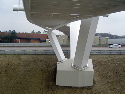 When the preliminary visuals for this bridge came out some time ago on the architect’s website, I thought it looked quite nice, appealing in its height and slenderness. In real life, the sheer scale of the bridge is much more difficult to accept. The bridge deck is roughly 100m long, with a 67m clear span. The masts are 38m high. It’s nowhere near as big as the Newport bridge (70m tall, 145m main span), but it’s still a very large structure to span a motorway. The span length is driven by the presence of two motorway slip roads, and a watercourse, forcing the bridge to be much larger than is normally required on motorways.