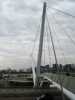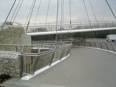The bridge looks attractive enough when viewed from the motorway, but as a pedestrian it is quite overpowering. The masts tower far above you, and their angle of inclination makes them loom in a way that I don’t recall experiencing with vertical masts. What seems like a simple enough cable system when viewed in elevation becomes not only complex but positively confusing from most other perspectives. This is true of the forestays, but doubly so for the backstays. As well as tying the masts back to anchorage foundations, these also support a secondary deck, which curves below the main deck and provides part of a shallow gradient ramp access to the bridge’s north end. The end result is a web of cables with little apparent visual order.
