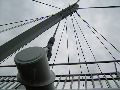 What seems like a simple enough cable system when viewed in elevation becomes not only complex but positively confusing from most other perspectives. This is true of the forestays, but doubly so for the backstays. As well as tying the masts back to anchorage foundations, these also support a secondary deck, which curves below the main deck and provides part of a shallow gradient ramp access to the bridge’s north end. The end result is a web of cables with little apparent visual order..jpg) In the main span, the confusion is partly caused by the presence of a set of tie-down cables, two on each side of the deck, which anchor the foremast to the foundations. These are an odd presence on an asymmetric cable-stayed bridge, where normally the anchor cables are only required at the “rear end” of the bridge. Here, I guess the main deck is insufficiently heavy to hold the main masts in place on its own, or they are needed because the masts are offset to the side of the deck, or they minimise movement and vibration in the masts. Compare the Swansea Sail Bridge as an example of a cable-stayed bridge with an offset mast which doesn’t need to be tied down in this way (and where the mast has been more artfully shaped).