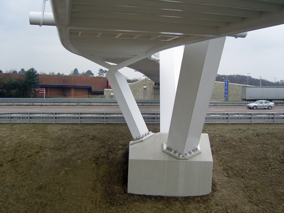 Three immediate precedents come to mind when viewing the Ashford bridge: Lancaster’s Lune Millennium Bridge (2001), and Newport’s City Footbridge (2006) are two. Closer to Ashford, Maidstone’s Lockmeadow Footbridge (1999) has a similar form. All four bridges share a resemblance to a giant crane, with twin masts tied together with cables, and a deck supported from cable stays. There are some structural advantages to this arrangement, chiefly that the angle of the cables supporting the deck is steeper, and hence they provide a stiffer and more efficient support. A significant disadvantage is that maintenance is more difficult, as cables are required with no low-level termination, making it more difficult to adjust or replace them in the future.